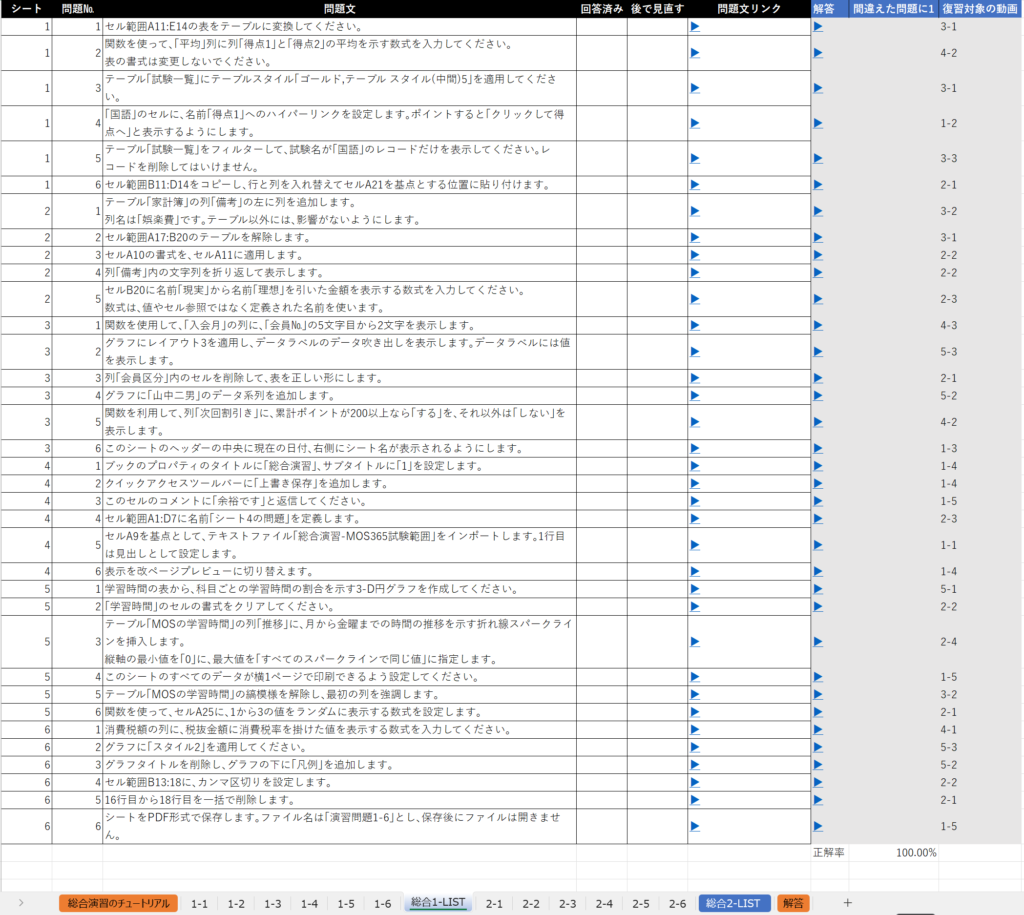 全91問を、5つのExcelファイルに集約。いくつものファイルをまたがないので、効率的に学習できます。問題文をクリックすると、解説動画に飛べます。