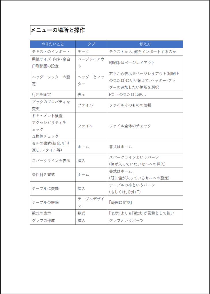 例えば「この操作は表示タブのこの辺にある」ていう風にもう覚えるんじゃなくて、「こういう系の操作はこの辺にある」って覚えましょう。「パソコンの表示に関する操作は表示タブ内にある」「Excelのファイルそのものに関する操作はファイルタブ内にある」。こういう風に「こういう系の操作この辺にある」って覚えておくと、試験範囲とか関係なく、「Excelでこれやりたいんだけどどの辺にあるかな」ってなった時に自分で探せます。