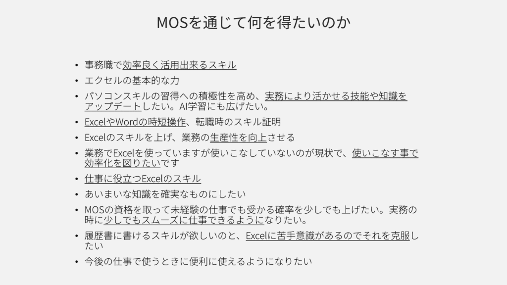 その方が、実践で柔軟な対応ができる。みたいなことをMOS講座を通じてわかってよかったと思います。