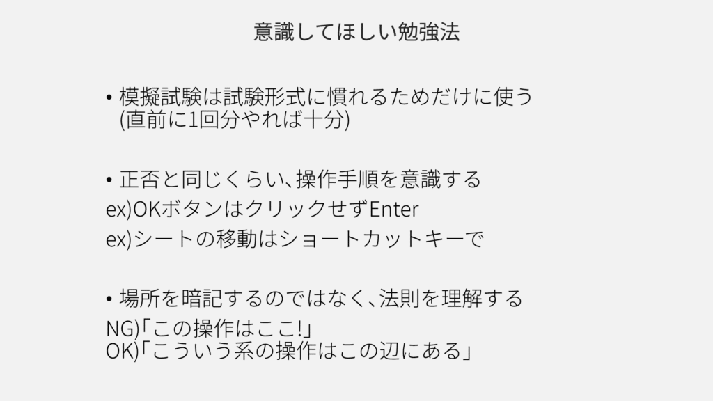 じゃあ何で差がついてるのかって言うと、操作スピードになります。MOSの勉強を、スピード操作の練習の場にしましょう。
