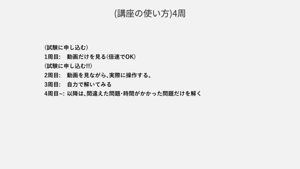 学習に使用したのはこの動画と送っていただいた演習問題のみです。受かるための必要なことが凝縮されています。
