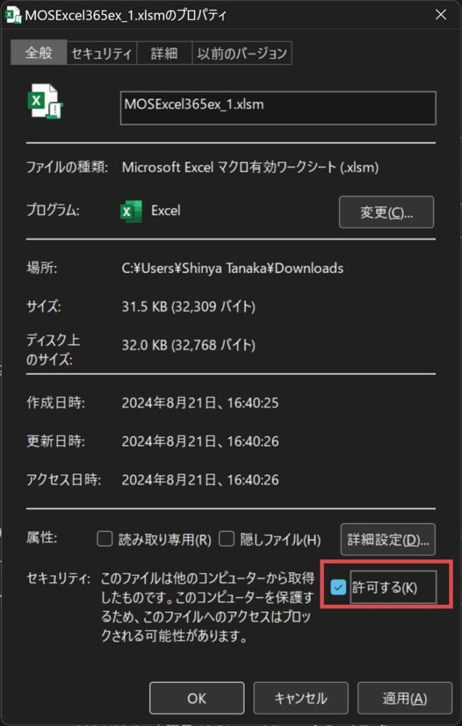 マクロを有効にするために、ダウンロード後、プロパティから以下の<許可する>にチェックをつけてください。